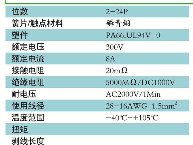 接線端子的絕緣材料用改性的尼龍(PA66),能達到或超過IEC947-7-1EN60947-7-1標準,阻燃等級達到UL94V-0具有良好的電氣性能和機械性能。螺絲用高強度的鋼制成鍍鋅或鎳處理,導電體四方針用合金銅制成表面鍍錫,壓片采用彈性及極強的磷青銅表面鍍錫或鎳;壓線框用抗應力裂縫腐蝕的合金銅制成,這些金屬表面還鍍錫或鍍鎳加以保護。設計完全符合IEC60947-7-1.GB14048.7等標準。